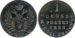 - ↑ 1 grosz (1823). fortresscatalogue.com. [dostęp 2023-10-31]. (pol.).