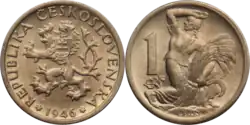 - 1 2 3 4 5 6 Czechosłowacja 1 korona, 1946-1947 [online], ucoin.net [dostęp 2018-06-05] [zarchiwizowane z adresu 2018-01-12] (pol.).