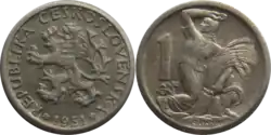 - 1 2 3 4 Czechosłowacja 1 korona, 1950-1953 [online], ucoin.net [dostęp 2018-06-05] [zarchiwizowane z adresu 2018-01-13] (pol.).