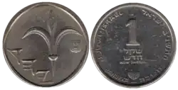 Awers monety nawiązuje do monety wybijanej w IV wieku p.n.e. (ok. 350 roku p.n.e.) w będącej częścią perskiego imperium Judei. Na awersie znajduje się kwiat lilii – symbol czystości i rozwoju Izraela w księdze Ozeasza[a]. Awers przedstawia również słowo „Jehud” w alfabecie paleohebrajskim i herb Państwa Izrael[2].