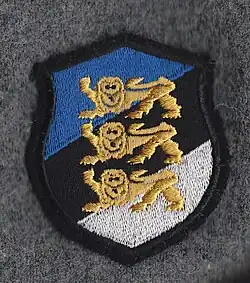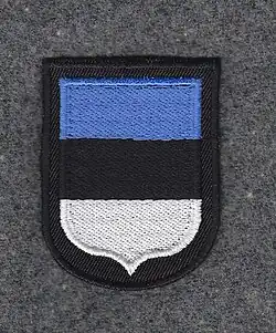 - Tarcze naramienne – Estończycy nosili także tarcze naramienne o symbolice narodowej. Tarcza składała się z trójpoziomowo ułożonych pasów – błękitnych, czarnych i białych. Nieraz na niebieskim polu spotykany był napis Estland. Tarcza występowała w dwóch wariantach: z poziomymi pasami oraz z pasami ukośnymi. Czasem na tarczach spotykano wzór trzech złotych lwów[10].