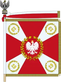 Płat sztandaru to biała tkanina w kształcie kwadratu o wymiarach 75x75 cm, po której obu stronach znajduje się krzyż kawalerski wykonany z tkaniny czerwonej. Jeden bok sztandaru wszyty jest w białą skórę. Boki sztandaru obszyte złotą frędzlą. Na stronie głównej płata, pośrodku krzyża kawalerskiego, znajdują się dwie gałązki wawrzynu, haftowane złotym szychem. Pośrodku wieńca umieszczony wizerunek orła białego z głową zwróconą do drzewca. W rogach płata umieszczone są wieńce z wawrzynu z numerem jednostki – 29.
