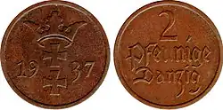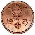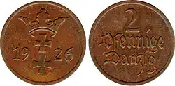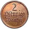 - ↑ RR-, Wolne Miasto Gdańsk, 2 fenigi 1923, kolor RB, STEMPEL LUSTRZANY [online], OneBid [dostęp 2024-10-10] (pol.).