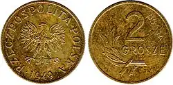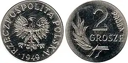 2 grosze 1949 – moneta dwugroszowa, wprowadzona do obiegu w dniu wymiany pieniędzy 30 października 1950, zarządzeniem z 14 lutego 1951 roku (M.P. z 1951 r. nr 14, poz. 196)[1], wycofana z obiegu z dniem denominacji z 1 stycznia 1995 roku, rozporządzeniem prezesa Narodowego Banku Polskiego z dnia 18 listopada 1994 (M.P. z 1994 r. nr 61, poz. 541)[1].