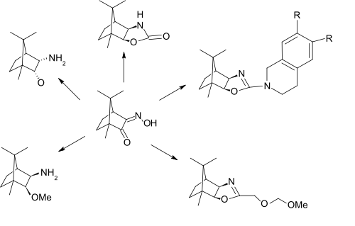3-Oksym kamforchinonu stosowany jest głównie jako półprodukt w syntezie różnego rodzaju pomocników chiralnych[6], np.: