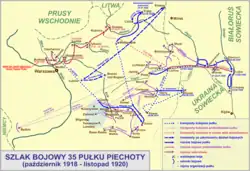 31 sierpnia 35 pułk piechoty został zawagonowany w Ciechanowie i przetransportowany do Chełma Lubelskiego[51]. 3 września odbyła się inspekcja pułków 9 Dywizji Piechoty, dokonana przez marszałka Józefa Piłsudskiego, a już 7 września pułk ruszył na front i obsadził zachodni brzeg Bugu, od Hrebennego przez Horodło, Matczę do Nagórnik. Tu otrzymał zadanie zdobycia mostu w Matczy i zajęcia leżącej na wschodnim brzegu Grajewki. Rano 10 września, po półgodzinnym przygotowaniu artyleryjskim, III batalion uderzył w kierunku mostu. Sowieci odparli atak, a ich artyleria skutecznie ostrzelała pozycje III batalionu[50]. Kilkakrotnie powtarzane szturmy pododdziałów polskich na most nie dały spodziewanych rezultatów i natarcie na tym kierunku przerwano. 12 września wieczorem, zagrożeni okrążeniem od północy, Sowieci opuścili te pozycje i rozpoczęli odwrót[52]. 35 pułk ruszył do pościgu przez Horodło w kierunku Włodzimierza Wołyńskiego i Łucka. Nocą 17 września sforsowano Styr i opanowano Łuck. Tu omyłkowo polskie lotnictwo zbombardowały wkraczające do miasta oddziały. Byli zabici i ranni.
