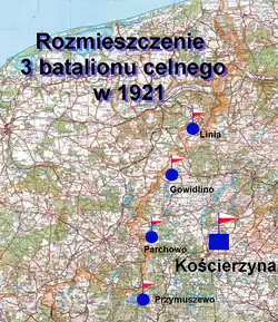 17 maja 1921 Główna Komenda Batalionów Celnych zarządziła zmiany dyslokacyjne batalionów. 3 batalion celny miał ochraniać odcinek granicy od Boszpola do Prądzony. Sztab batalionu rozlokowany miał być w Kościerzynie[13].