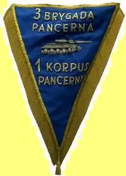 Krzyż kawalerski barwy pomarańczowej, pola między ramionami krzyża granatowe. Pośrodku haftowany kolorową nicią herb Poznania w otoku wieńca. Nad herbem haftowany złotą nicią napis: "3 BRYGADA PANCERNA", na dolnym ramieniu krzyża: "I KORPUSU". Na granatowych polach, u dołu, haftowana złotą nicią data: "22.IV.1945", w otoku wieńców laurowych[10].