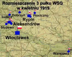 | Rozmieszczenie 3 p WSG we Włocławku na dzień 17 kwietnia 1919 (4/15)[i][j][19] | ||||||||