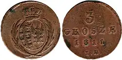 3 grosze (1810–1814) – miedziana moneta trzygroszowa Księstwa Warszawskiego, bita na podstawie dekretu Fryderyka Augusta, króla saskiego, księcia warszawskiego, z 25 czerwca 1810 r.[1]