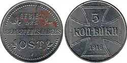 - ↑ RR-, 3 kopiejki 1916 OST J, Hamburg, mennicze, ZDWOJENIA DATY [online], OneBid [dostęp 2024-10-10] (pol.).