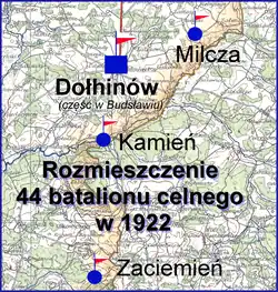 W czerwcu 1922 dowództwo batalionu przeniosło się z Budsławia do Dołhinowa z pozostawieniem w Budsławiu adiutantury, kompanii gospodarczej, oddziału karabinów maszynowych, izby chorych i taborów. Faktycznie do Dołhinowa przybył dowódca batalionu, część kancelarii i oficer do zleceń. 1 kompania przeniosła się do Milczy, a 2 kompania celna do Kamionki[9]. Z dniem 28 października, po wielu perturbacjach, odwołaniach i uszczegóławianiu rozkazów całe dowództwo batalionu i pododdziały sztabowe przybyły do Dołhinowa[10]