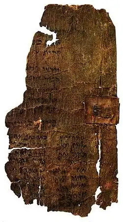 Rękopis ten jest wyjątkowy, można go dokładnie datować na okres panowania króla Jonatana. Zachowały się trzy kolumny pisma, jedna u góry oraz dwie poniżej. Górna kolumna (A) oraz dolna lewa (C) są niekompletne. Skóra jest rozdarta wzdłuż dolnej trzeciej kolumny obok prawego marginesu. Manuskrypt zawiera też łatkę z otworem wykonaną z niegarbowanej skóry o wymiarach 2,9 na 2,9 cm, na brzegu prawej krawędzi. Pozostałości pasków skóry, które zmarszczyły kartę przez środek od prawego brzegu, świadczą prawdopodobnie że zwinięty zwój był wiązany. Zewnętrzny brzeg karty, zapewne z fragmentami mocowań, zdaje się wskazywać, że zachowane teksty znajdowały się na początku zwoju, który pierwotnie był dłuższy. Różnice między położeniem kolumn A i B i C mogą wskazywać, że praca ta nie jest dziełem jednego skryby.