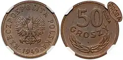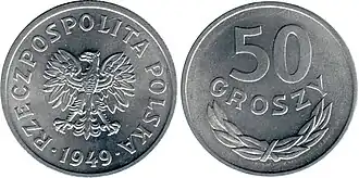 50 groszy 1949 – moneta pięćdziesięciogroszowa, bita w miedzioniklu i alupolonie[1]. Odmiana w miedzioniklu wprowadzona do obiegu z dniem reformy walutowej z 30 października 1950 r., zarządzeniem z 14 lutego 1951 r. (M.P. z 1951 r. nr 14, poz. 196), odmiana w alupolonie 26 września 1956 r. zarządzeniem Ministra Finansów z 12 września 1956 r. (M.P. z 1956 r. nr 80, poz. 963). Moneta została wycofana z obiegu z dniem denominacji 1 stycznia 1995 r. zarządzeniem prezesa Narodowego Banku Polskiego z 18 listopada 1994 r. (M.P. z 1994 r. nr 61, poz. 541)[1].