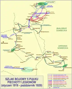 17 kwietnia 5 pułk piechoty zdobył Lidę, a następnie został przewieziony do Wilna. Wspomagał tam walczącą kawalerię płk. Beliny-Prażmowskiego. Pułk walczył na Litwie przez całą wiosnę i lato. Zdobył Nową Wilejkę, Podbrodzie, walczył pod Mejszagołą, Rukojniami i doszedł do Dźwiny. We wrześniu 1919 roku bił się na północnym odcinku frontu wzdłuż Dźwiny. Pod Dryssą i Krasławkami zlikwidował sowieckie przyczółki. W rejonie Święcian nastąpił krótki odpoczynek. Pod koniec grudnia pułk ponownie wyruszył nad Dźwinę, aby wspólnie z oddziałami wojsk łotewskich walczyć w Dyneburgu. 3 stycznia 1920 roku 5 pp sforsował po lodzie zamarzniętą Dźwinę, zajął wschodnie przedmieścia i zamknął tym samym drogę odwrotu Armii Czerwonej[16]. Prowadząc działania zaczepne, pod koniec stycznia doszedł do jeziora Oświejskiego. Dyneburg opuścił w kwietniu i pomaszerował w rejon koncentracji 3 Armii gen. Śmigłego-Rydza.