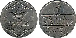 - ↑ Wolne Miasto Gdańsk - 5 fenigów 1928 NGC PF65 CAMEO - stempel lustrzany - RZADKOŚĆ [online], OneBid [dostęp 2024-10-10] (pol.).