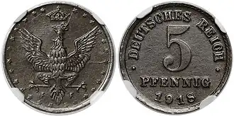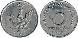 - ↑ Królestwo Polskie, destrukt 5 fenigów 1918 - HYBRYDA - niemiecki rewers - RZADKOŚĆ [online], OneBid [dostęp 2024-10-10] (pol.).