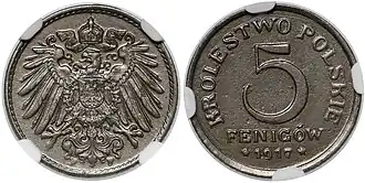 - ↑ RRR-, Królestwo Polskie, 5 fenigów 1917 FF, mała data, pierwszy raz a onebid! [online], OneBid [dostęp 2024-10-10] (pol.).