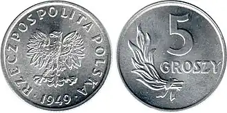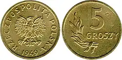5 groszy 1949 – moneta pięciogroszowa, wybita w brązie[1] i alupolonie[2] (w niektórych źródłach jako aluminium[3][4]). Odmiana w brązie została wprowadzona do obiegu 30 października 1950 r., zarządzeniem z 14 lutego 1951 r. (M.P. z 1951 r. nr 14, poz. 196), a odmiana w alupolonie 26 września 1956 r., zarządzeniem Ministra Finansów z 12 września 1956 r. (M.P. z 1956 r. nr 80, poz. 963). Obie odmiany zostały wycofane z obiegu 1 stycznia 1960 r. zarządzeniem Ministra Finansów z 17 kwietnia 1958 r. (M.P. z 1958 r. nr 31, poz. 177)[5][6].