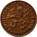 - 1 2 Zákon ze dne 22. června 1922 o ražbě dalších drobných mincí, „Sbírka zákonů”, č. 195/1922 Sb. (čá 67/1922), epravo.cz, 22 lipca 1922 [dostęp 2018-05-15] [zarchiwizowane z adresu 2018-05-11] (cz.).
