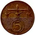 - 1 2 3 4 5 Michal Biľak, Miroslav Jízdný, Zberateľský katalóg mincí Československa 1980, wyd. II, Koszyce: Slovenská numizmatická spoločnosť, 1981 (słow.). za: Ľudovít Malinovský sr., ČSR 5 h 1923 Karlov most [online], coins.lmsystem.sk [dostęp 2018-05-15] [zarchiwizowane z adresu 2016-05-27] (słow.).