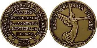 (pol. wizyta w mennicy brukselskiej polskiego ministra jego ekscelencji M.Jackowskiego), na samy dole data roczna: „* 1930 *”, całość w otoku z półperełek[1].