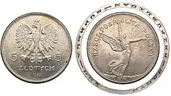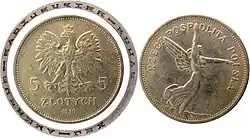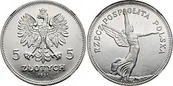 | 5 złotych 1932 | Nike | Warszawa | herb Kościesza | 104 000[6] albo 3 100 000[7] |