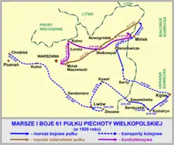 | powstanie wielkopolskie wojna polsko-bolszewicka bitwa o przedmoście warsz. (13–16 VIII 1920) bitwa nad Niemnem (20–26 IX 1920) kampania wrześniowa bitwa o Pomorze (1–3 IX 1939) bój na linii jezior koronowskich (2 IX 1939) bój o przedmoście bydgoskie (2–4 IX 1939) bitwa nad Bzurą (9–18 IX 1939) bój pod Płockiem (14–15 IX 1939) | |