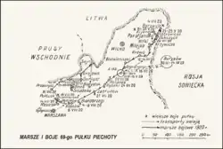26 sierpnia 69 pułk piechoty przemieścił się do Łomży, 30 sierpnia przeszedł w rejon Śniadowa, a 5 września zajął rejon Krasnopol − Krasne − Sejny, wysyłając na linię demarkacyjną z Litwą batalion obserwacyjny. II batalion w utarczkach z Litwinami na linii Galińce − Wigrańce − Berżniki zdobył wyposażenie jednej baterii artylerii ciężkiej, kilka kuchni polowych, 11 karabinów maszynowych i wziął do niewoli dużą liczbę jeńców[26]. Pułk pozostawał na linii demarkacyjnej do 29 listopada, pełniąc tam służbę na przemian z 70 pułkiem piechoty. W tym dniu został zluzowany przez 41 suwalski pułk piechoty. Po zluzowaniu, marszem pieszym przegrupował się do Białegostoku, skąd koleją przewieziony został do Bydgoszczy[26].