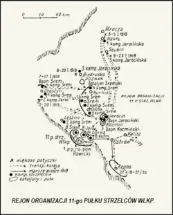 W tym samym czasie w Kórniku przystąpiono do organizacji kompanii pod dowództwem ppor. Mariana Trawińskiego (a następnie ppor. Sylwestra Gawrycha), która ruszyła na front pod Leszno[4]. W dniach 7 do 17 stycznia 1919 batalion śremski wszedł do walki pod Łomnicą i Strzyżewem. Następnie powrócił do Śremu i po reorganizacji powrócił na front na odcinek Miejskiej Górki, a w lutym brał udział w zajmowaniu kolejnych miejscowości[4]. W skład II batalionu pułku weszły: batalion jarociński ppor. Zbigniewa Ostroroga-Gorzeńskiego i 1 kompania batalionu koźmińskiego Michała Lorkiewicza. 1 kompania pod dowództwem ppor. Bronisława Kirchnera działała w rejonie Nakła, zajmując miejscowości Mrocza i Ślesin. W początkach lutego kompania skierowana została do wzmocnienia frontu w rejonie Miejskiej Górki. W tym samym czasie na froncie rawickim walczył batalion koźmiński ppor. Józefa Modlibowskiego, którego później dwie kompanie weszły w skład 11 pułku strzelców[5]. Bazą III batalionu stał się batalion jutrosiński i 2 kompania batalionu koźmińskiego[5].