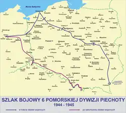 17 stycznia 1945 sforsowała Wisłę i zdobyła Warszawy. W lutym walczyła o przełamanie Wału Pomorskiego, a następnie o Kołobrzeg. W czasie walk na Wale Pomorskim wchodzący w skład dywizji 18 Pułk Piechoty wyzwolił obóz jeniecki w Gross-Born w którym Niemcy więzili około 1200 oficerów. Wśród nich byli: Stefan Mossor, Leon Kruczkowski i Stanisław Ryszard Dobrowolski[5]. 16 kwietnia sforsowała Odrę w rejonie Siekierek i toczyła walki o wał Starej Odry. Jako pierwsza wielka jednostka Wojska Polskiego dotarła 3 maja do Łaby, a jej żołnierze spotkali się z oddziałami 9 Armii USA.