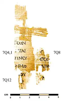- ↑ P. Benoit: Note sur les Fragments Grecs de la Grotte 7 de Qumran. Revue Biblique, 1972, s. 321-324. (fr.).