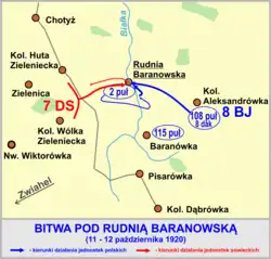 Dywizjon wziął też udział w zagonie na Korosteń. 8 października osłaniał 115 pułk ułanów przed atakami brygady baszkirskiej. 12 października dywizjon z składzie 8 BJ ruszył w kierunku Zwiahla. 2 bateria maszerowała w ugrupowaniu 2 pułku ułanów, a za nim dwa działa 3 baterii i 1 bateria. Przy folwarku Krasnogórka pododdziały polskie wpadły w zasadzkę. W walce ciężko ranni zostali: ppłk Buol i kpt. Rozwadowski oraz 7 kanonierów; stracono 16 koni. Dowództwo dywizjonu objął por. Stanisław Żarczewski, który pozbawiony ognia własnej artylerii ruszył do szarży z częścią szwadronu ułanów torując drogę 1 baterii do zajęcia stanowisk[15]. Jeszcze tego samego dnia w nocy w Rudni Baranowickiej zaatakowany został przez sowiecką piechotę 2 pułk ułanów. Ułani cofnęli się, odsłaniając stanowiska dywizjonu. Artylerzyści otworzyli ogień ze wszystkich swych dział i karabinów maszynowych. Sytuacja była wyjątkowo groźna. Noc nie pozwalała odróżnić oddziałów nieprzyjaciela od własnych. Spieszone pułki polskiej jazdy przystąpiły do kontrataku, a dywizjon wspierał je ogniem. Były to ostatnie strzały 8 dywizjonu w tej wojnie[16][17]. W kolejnych dniach dywizjon stacjonował w Toporkach, następnie przemaszerował do Zwiahla, a parę dni potem przeszedł na dłuższy postój w Kurmaniu.