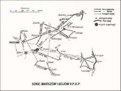 Z Pińska I/9 pap maszerował wspólnie z 15. i 22 pułkiem piechoty nad Styr[27]. Po drodze baterie 2. i 3. stoczyły walkę pod Rzeczycą, zaś 1 bateria w rejonie Pohostu. Po dotarciu do Pińska wyłączono ze składu dywizjonu 4 baterię i nakazano jej wejść w ugrupowanie 16 Dywizji Piechoty. Bateria, bez osłony piechoty, ruszyła w kierunku Chomska. 28 lipca, na wąskiej grobli koło Markowicz, pod ostatnim jaszczem załamał się mostek, a jednocześnie bateria została zaatakowana przez silny oddział sowiecki. Obsługi broniły się ogniem broni ręcznej, a później walcząc wręcz. Tylko niedobitkom udało się odskoczyć[28]. Tymczasem gros dywizjonu przez Ratno i rejon Brześcia dotarło na zachodni brzeg Bugu. 5 sierpnia 2 bateria brała udział w kontrataku 22 pułku piechoty, który doprowadził do wyrzucenia sowietów na wschodni brzeg Bugu. Nie udało się jednak odzyskać Brześcia[29].