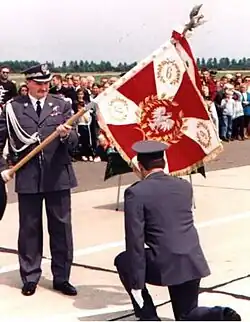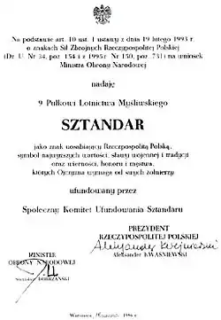 W dniu 18 czerwca 1996 roku generał dywizji pilot Mieczysław Walentynowicz, w imieniu Prezydenta RP, wręczył dowódcy jednostki podpułkownikowi Piotrowi Luśni sztandar ufundowany przez Społeczny Komitet Ufundowania Sztandaru pod przewodnictwem Franciszka Klima. Rodzicami chrzestnymi sztandaru byli Bogumiła Betlej i podpułkownik rezerwy Jacek Tuteja.