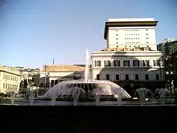 Piazza De Ferrari: fontanna (na pierwszym planie), budynek uczelni (po prawej) i Teatro Carlo Felice (z tyłu)