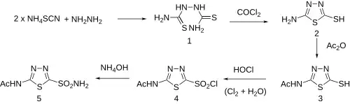 Synteza chemiczna acetazolamidu rozpoczyna się od reakcji hydrazyny z tiocyjanianem amonu, w wyniku której powstaje 2,5-ditiobimocznik. Związek ten poddaje się reakcji cyklizacji z fosgenem, otrzymując 2-amino-5-merkapto-1,3,4-tiadiazol, na który działa się bezwodnikiem octowym acetylującym grupę aminową. Tak powstały związek poddaje się reakcji z chlorem, a następnie z amoniakiem, otrzymując acetazolamid[32].