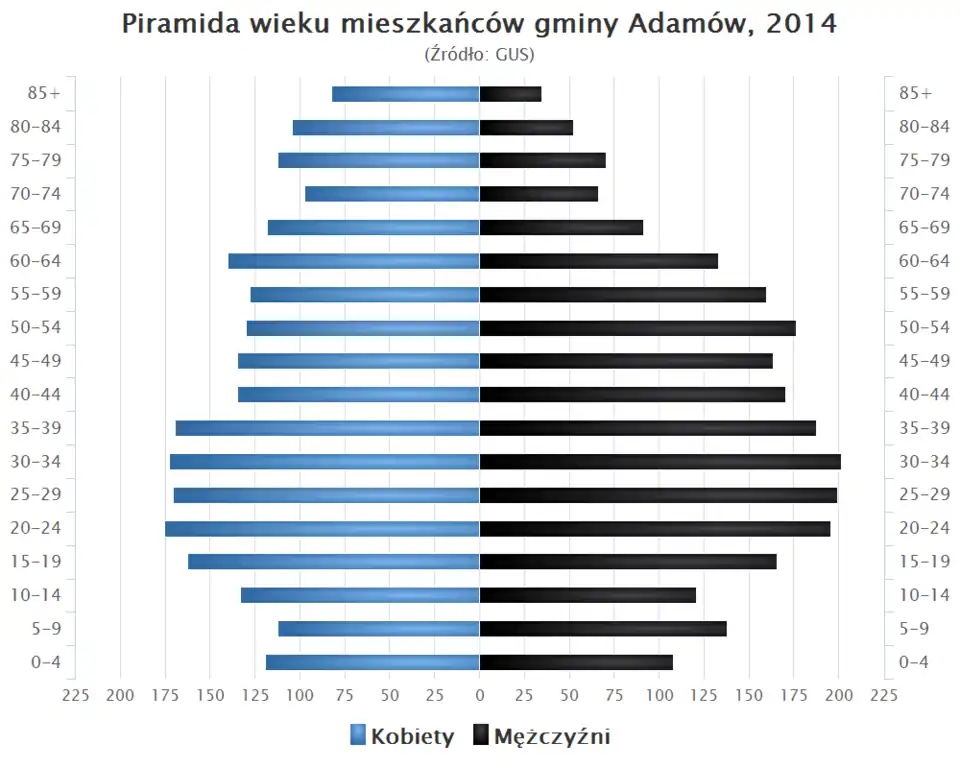 - Piramida wieku mieszkańców gminy Adamów w 2014 roku[1].
