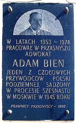 - ↑ Dzieje swojego życia w latach wojny Adam Bień opisał we wspomnieniach, Adam Bień, „Bóg wyżej - dom dalej. 1939-1949”, Ludowa Spółdzielnia Wydawnicza, Warszawa 1991