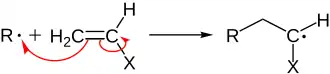 Addycja rodnikowa polega na przyłączeniu się rodnika do obojętnej cząsteczki, podczas którego następuje rozerwanie wiązania wielokrotnego[1]. W efekcie tworzy się nowy produkt rodnikowy z jednym niesparowanym elektronem[1]. Przykładem takiej reakcji jest addycja rodnika do dowolnego alkenu[1]: