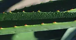 - Długość liści zwykle wynosi 70–100 cm, rzadko dochodzi nawet do 200 cm. Lekko faliste brzegi uzbrojone są w kolce o długości 3 mm, wyrastające w odstępie 1–2 cm. Na końcu liścia ciemnobrązowy, stożkowaty kolec o długości do 2 cm[3].