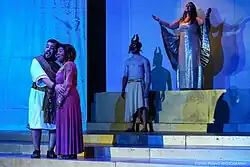 | Faraon | M | poboczna | Ojciec Amneris i król Egiptu. Próbuje przyspieszyć ślub Amneris i Radamesa, aby pomóc córce. Potajemnie otruty przez Zosera (Dżosera). | mowa | Daniel Oreskes |
