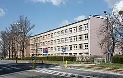 Szkoła mieści się w budynku dawnego Centralnego Ośrodka Wyszkolenia Straży Pożarnej, wzniesionego w stylu funkcjonalistycznym w latach 1937–1938 według projektu Jana Redy[9][10]. Pierwsi kursanci rozpoczęli w nim naukę w marcu 1939[11]. Budynek został częściowo uszkodzony w 1944. Został odbudowany w 1948[9]. W latach 1966–1970 został rozbudowany, powstała wtedy m.in. hala sportowa[4].