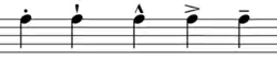 - wynikają one z samej natury rytmu. Akcentowane są te nuty, które rozpoczynają proste schematy metryczne zebrane w takcie. Są to akcenty metryczne. Dodatkowo akcentowane są, choć nieco słabszym akcentem pierwsze nuty grup powstałych z rozdrobnienia dźwięków. I tak na przykład w metrum trzy czwarte trzecia ćwierćnuta może być zastąpiona grupą czterech szesnastek i choć ta część metrum nie jest akcentowana, pierwsza nuta z grupy wyróżniana jest drobnym akcentem. Jest to akcent grupowy.