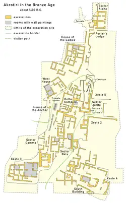Pierwsze wykopaliska rozpoczęto w XIX wieku, jednakże regularne prace zaczęły się w 1967 pod kierownictwem Spiridona Marinatosa. Do roku 2006 odkopano 12 domów, solidnie zbudowanych z ciosów kamiennych, mających do 3 kondygnacji. Znaleziono również pozostałości waz minojskich i mebli oraz inskrypcje w piśmie linearnym A. Najciekawsze są bardzo dobrze zachowane freski przedstawiające najczęściej sceny z życia codziennego – jeden z najbardziej znanych przedstawia dwóch chłopców niosących ryby. Pierwsza odnaleziona osada datowana jest IV tysiąclecie p.n.e., natomiast szczyt rozwoju miasta przypada na okres pomiędzy XX a XVI wiekiem p.n.e. W tym okresie miasto obejmowało obszar ponad 20 ha i miało kilka tysięcy mieszkańców, zajmujących się głównie handlem. Ulice były wąskie, mieszkania jednak obszerne, zbudowane z cegły glinianej, z gipsowanymi ścianami, toaletami połączonymi z kanalizacja miejską. Do niektórych domów doprowadzone były dwie rury z wodą, prawdopodobnie w jednej z nich była ciepła woda pochodząca ze źródeł termalnych.