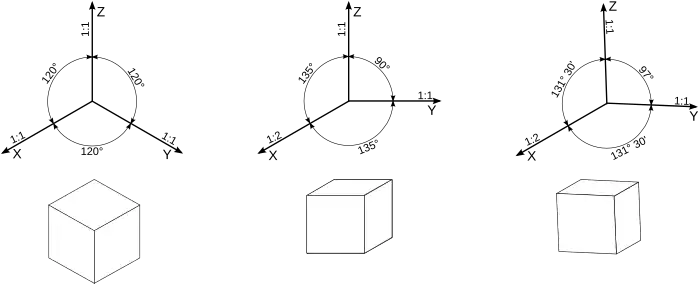 - trimetria (anizometria) – każda z osi układu prostokątnego tworzy z rzutnią inny kąt i podlega innemu skrótowi[1].