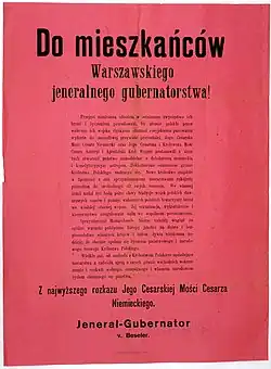 - ↑ Było to tym bardziej oczywiste, że już 9 listopada ukazała się nowa proklamacja obu gubernatorów, w sprawie ochotniczego wstępowania do wojska, w której oświadczali m.in. Powaga i niebezpieczeństwa tych ciężkich chwil wojennych, oraz troska o wojska nasze, stojące w obliczu wroga, zmuszają nas zachować zarząd nowego państwa Waszego tymczasowo jeszcze w naszych rękach. Pragniemy jednak chętnie dać mu już teraz przy Waszym współudziale stopniowo urządzenia państwowe, które mają poręczyć trwałe ugruntowanie państwa Waszego, jego ukształtowanie i bezpieczeństwo. Na pierwszem więc miejscu wojsko polskie. Nie ustał jeszcze bój z Rosją: w walce tej i Wy pragniecie wziąć udział. Stańcie więc przy nas, jako ochotnicy i pomóżcie nam uwieńczyć zwycięstwo nasze nad Waszym prześladowcą. (Do ludności Jeneralnych Gubernatorstw lubelskiego i warszawskiego!).