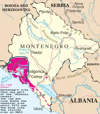 Po upadku powstania Skanderbega (1455-1479) Wenecja zawarła 25 stycznia 1479 r. z Turcją pokój w Stambule. Na mocy tego układu Republika utraciła na rzecz Turków wszystkie posiadłości poza wybrzeżem Zatoki Kotorskiej, w szczególności Szkodrę, Lezhë i Drisht, i jedynie czasowo, jako rekompensatę za utratę Szkodry, zachowała Budvę, Bar, Ulcinj i Durrës. W 1482 r. Turcy zajęli Castelnuovo (Herceg Novi). W toku kolejnej wojny wenecko-osmańskiej (1499–1503) w 1501 r. Turcy odebrali Wenecji Durrës, jednak pokój kończący tę wojnę pozostawił w rękach Wenecji Bar i Ulcinj. Miasta te Wenecja utraciła na rzecz imperium osmańskiego w 1573 r. wraz z częścią Albanii Weneckiej leżącą na południe od Budvy. W 1687 r. Wenecja zbrojnie odzyskała Herceg Novi. Ostatecznie pod władzą Republiki Wenecji pozostało tylko wybrzeże Zatoki Kotorskiej z portami Cattaro (Kotor), Risano (Risan), Perasto (Perast), Teodo (Tivat) i Castelnuovo (Herceg Novi) oraz przylegający od południa do ujścia tej zatoki brzeg otwartego morza z portem Budua (Budva). Obszar ten pozostał w granicach Republiki Wenecji do jej upadku w 1797 r.