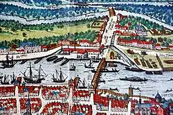 - ↑ Fragment Civitates orbis terrarum – na ilustracji m.in. składy towarów i budynki celników, Most Długi, Droga Łasztowa i most nad Parnicą oraz Kościół św. Gertrudy.
