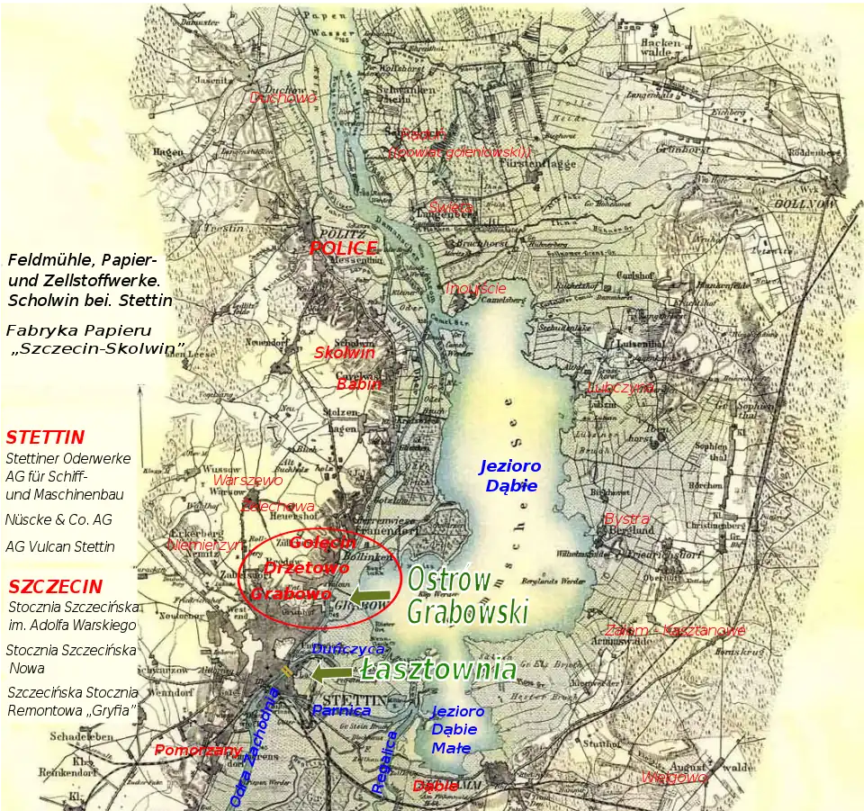 Nadające się do wykorzystania elementy wyposażenia stoczni i innych szczecińskich zakładów przemysłowych były wywożone przez Rosjan[f]. Trosce o świadectwa historii rozwoju techniki w Szczecinie nie sprzyjał też niechętny emocjonalny stosunek powojennych mieszkańców Szczecina do tych zabytków; usprawiedliwia to tęsknota za utraconymi w wyniku wojny stronami rodzinnymi, podobna do żalu z powodu konieczności wyjazdu z Grabowa jego dawnych mieszkańców (długo żywili nadzieję, że miasto zostanie po stronie niemieckiej)[10]. W tym świetle obiecujący jest fakt, że na wyspie Łasztownia działa Stara Rzeźnia – Centrum Kultury Euroregionu. Odbywają się tam imprezy kulturalne, w których uczestniczy również młodzież niemiecka. Rzadko podkreśla się, że miejska rzeźnia (obecnie obiekt zabytkowy) została wybudowana w latach 1886–1898 na terenie wcześniejszej cieślarni miejskiej oraz składów drewna i smoły dla cieśli okrętowych[14].